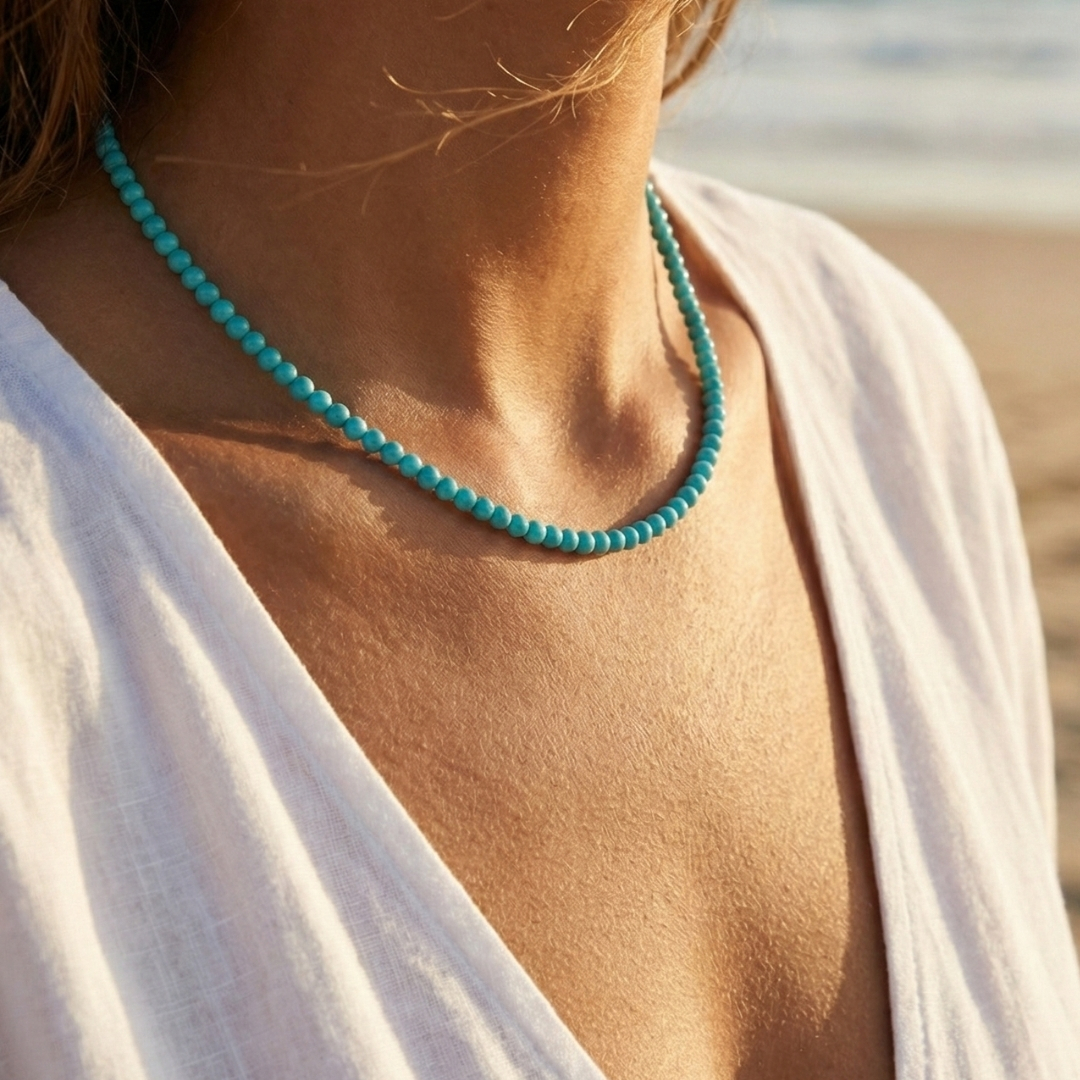 Pensada para mulheres que valorizam estilo, praticidade e sofisticação, o Colar clássico pedra natural turquesa esverdeada foi desenvolvido para elevar o seu visual em qualquer ocasião. Seu design cuidadosamente elaborado combina charme contemporâneo com funcionalidade, resultando em uma peça que traduz perfeitamente a essência da AMEI DE PAIXÃO: refinada, versátil e apaixonante.